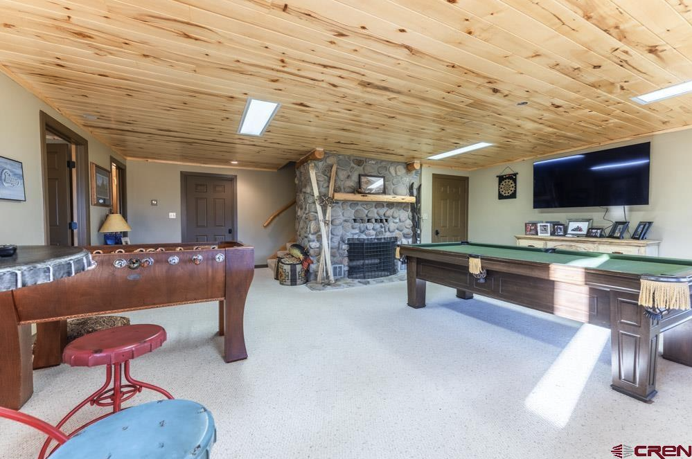 and-groove ceilings, hardwood flooring, lower-level game room with a 65” TV, pool table, foosball table, and game table, with a woodburning fireplace. Entertaining on the oversized wrap-around deck works well because of the easy access into the kitchen /dining/living areas. Even the grounds are tastefully landscaped with mature aspens and evergreens, split-rail log fencing surrounding the home, a comfortable firepit & circular driveway.